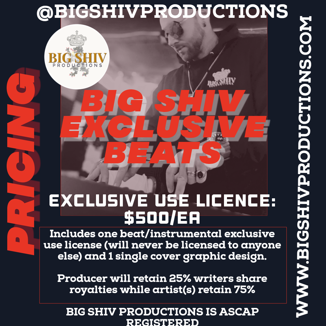 With music from all genres, there is something for everyone. Browse Big Shiv beats and when you find the one(s) your’e looking for contact me with the name of the instrumental so that I can make sure it hasn’t been licensed by another artist. Big Shiv Productions only uses Exclusive Use Licenses, which ensure that an instrumental is only used for one song or artist(s). The Exclusive Use License for an instrumental costs only $500 and includes single cover art design. As the composer/producer of the music I will retain 25% of the songs royalties and the artist(s) and/or their respective labels will retain 75%. Big Shiv Productions is an ASCAP registered composer/writer & publisher. As a condition of the license Big Shiv Productions must be given spoken & written credit for production in official publishing and releases (e.g. “Song Name” by “artist name” prod. Big Shiv). Start browsing for your next beat today, or if you’d like help finding the right beat/genre for you, contact me via FB, IG, or email.